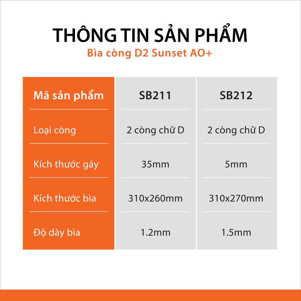 - Bìa file còng A4 Sunset được thiết kế độc đáo với hai còng chữ D giúp giữ tài liệu của bạn một cách ngay ngắn, chỉn chu hơn so với bìa nhẫn chữ O thông thường, sản phẩm là lựa chọn phù hợp với công việc văn phòng, học tập giúp bảo quản giấy tờ, đựng hồ sơ, sử dụng với bìa lỗ (khổ giấy A4).